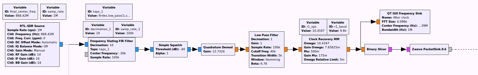 I’ve used scapy-radio for receiving Z-Wave frames. They have implemented blocks for 2. set(40Kbps|FSK|NRZ) and I’m trying to configure blocks for 1. set (9.6Kbps|FSK|Manchester). However, I am not able to receive frames like for 2. set and I would like to ask what could be wrong.